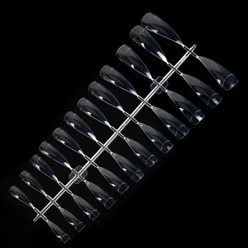 Kvalitní a pevné čiré tipy na nehty v populárním špičatém tvaru - stiletto, vyrobené z odolného ABS materiálu, vhodné pro profesionální nehtovou modeláž i domácí použití.